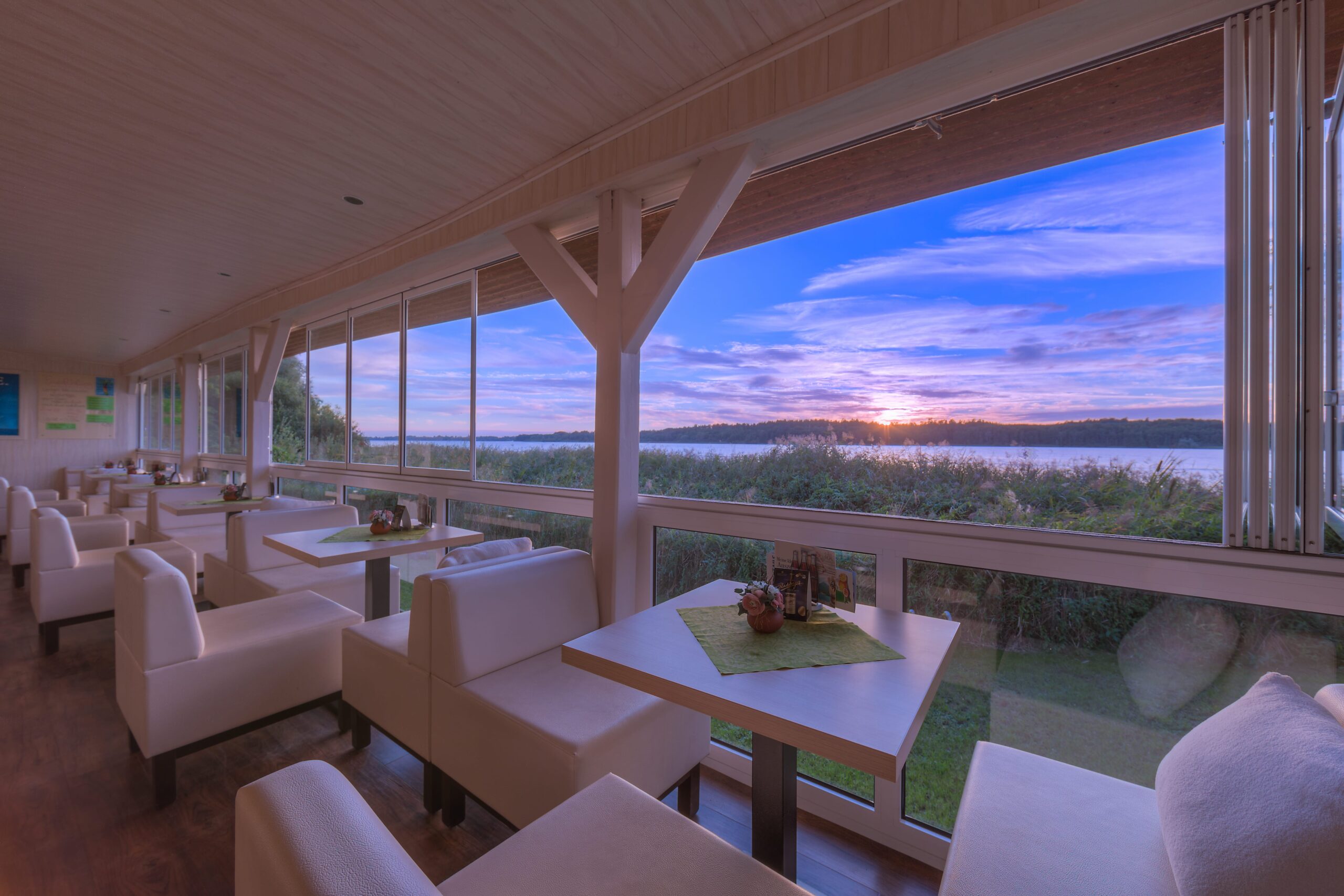 Große Flexible Glaselemente öffnen eine Gaststätte zur Müritz hin. Dessen große Fensterflächen machen das Panorama zum Erlebnis. Sie erfüllt den Wunsch, das „Kleine“ Meer zu sehen. Weite